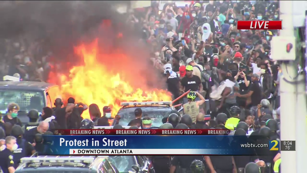 “We continue to monitor protestors on Centennial Olympic Park Drive near Marietta Street. The demonstration began peacefully with protestors marching from Centennial Olympic Park to the Capitol and back. Upon returning to Centennial Olympic Park, the majority of protestors entered into the park while a portion walked south on Centennial Olympic Park Drive where they surrounded an officer inside his patrol vehicle. Additional officers arrived and began to push protestors back away from the vehicle, which led to a number of scuffles between police and protestors and at least three arrests. One officer was pushed to the ground and sustained minor injuries. It does appear pepper spray was utilized several times during the confrontation. Currently, we are attempting to allow the protestors to continue with a peaceful demonstration. Officers have been subjected to water bottles, eggs and other items being thrown at them. However we remain hopeful this activity will cease and there will be no need for further arrests or clashes with protestors. “